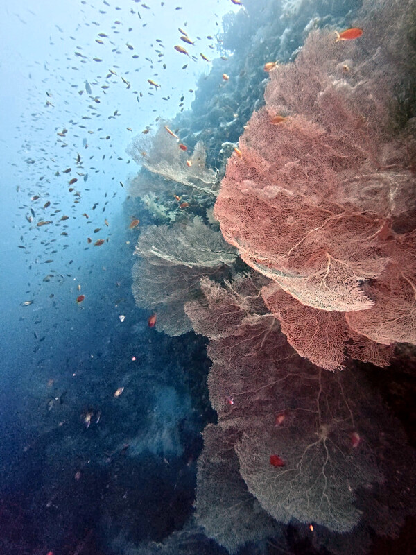 An der Musa angekommen genossen wir erneut die Suppe, die uns wärmte, und im Anschluss das reichhaltige Mittagessen. Danach ging es nach Ham Ham. Wir bewunderten die Gorgonien, konnten jedoch keinen LaNaBüBa entdecken. Trotzdem sind die Gorgonien ein unglaubliches Naturschauspiel, das ein Highlight für jeden Taucher darstellt, egal wie oft man in Ham Ham schon unterwegs war. Im Blau tanzten Unmengen an Füsilieren umher. Sie schwammen in den wildesten Formationen und wir hätten ihnen stundenlang zuschauen können. Doch plötzlich verschwanden alle … Wer kommt jetzt wohl aus dem Blau hervor? Jagende Thunfische schossen aus dem Blau hervor wie Blitze, die einschlugen. Ein beeindruckendes Schauspiel! Anschließend machten wir uns auf den Weg aufs Plateau. Auch hier lag Liebe in der Luft, denn zwei gefährliche Schönheiten waren auf Kuschelkurs: Zwei Skorpionfische lagen Schulter an Schulter im Sand. Oder sagt man eher Flosse an Flosse? Am Riff entdeckten wir noch einen kleinen Napoleon, der gerade sein Seepferdchen machte, weshalb er sich nah am Riff aufhielt. Meerbarben standen wie gewohnt in der Strömung und boten uns einen farbenfrohen Abschluss zu diesem gelungenen Tauchtag. Also Köpfchen aus dem Wasser und ab zu Hamada und seiner Crew. Dort angekommen machten wir uns bei etwas Welle und Wind auf den Heimweg, denn im heimischen Hafen werden wir schon erwartet.