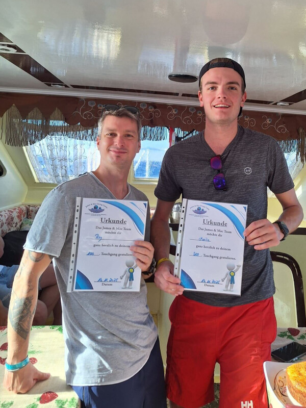 Als zweiten Tauchgang entschieden wir uns erneut für einen Drift zur Leine, diesmal bei Ras Disha. Hier begeisterten uns neben weiterhin guten Sichtverhältnissen und keiner Strömung Schwärme von Füsilieren, Anemonenfischen, Flötenfischen, Straßenkehrern, Dickkopfmakrelen, Barrakudas, Hornhechten und vieles mehr. Als besonderen Augenschmaus sahen wir gleich drei Oktopoden: einen einzeln und zwei dicht beieinander, die sehr süß miteinander interagierten. Dann gab es auch noch zwei Jubiläen zu feiern: einmal den 100. TG von Ray und den 500. TG von Moritz. Eine tolle Leistung! Im Namen des gesamten James & Mac-Teams: Herzlichen Glückwunsch und weiter so! Nun sind wir, mit leckerem Jubiläumskuchen und guter Laune, auf der Rückfahrt in heimische Gefilde und freuen uns auf die Taucherlebnisse der anderen Böötchen und auf unseren lieben Osama mit einem Kaltgetränk unserer Wahl. Ein rundum chilledkrötiger wie gleichermaßen oktaktischer Tauchtag neigt sich dem Ende zu! Vielen Dank an alle Beteiligten & liebe blubberige Grüße, Euer Team Basi