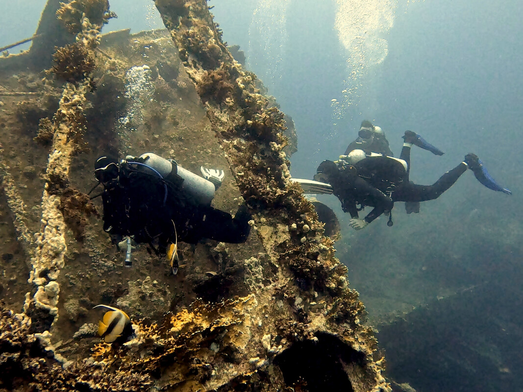 Unser zweiter Tauchgang führte uns zur Giannis D., einem Frachtschiff, das seit 1983 auf dem Meeresgrund liegt. Das Wrack ist stellenweise betauchbar und sowohl von innen als auch von außen absolut beeindruckend. Wunderschöner Korallenbewuchs, Seesterne, Schnecken sowie arabische Kaiserfische und ein Schwarm Füsiliere machten diesen Tauchgang zu einem weiteren Highlight. Zurück an Bord war der Hunger groß – genau zur richtigen Zeit, denn es wartete bereits ein leckeres Mittagessen auf uns. Während wir entspannt aßen, nahm unser Kapitän schon Kurs zurück Richtung Heimat. Im Hafen angekommen, ließen wir den Tag gemeinsam im Shaab Stella ausklingen – mit vielen Gesprächen, strahlenden Gesichtern und Erinnerungen an einen rundum gelungenen Tauchtag.