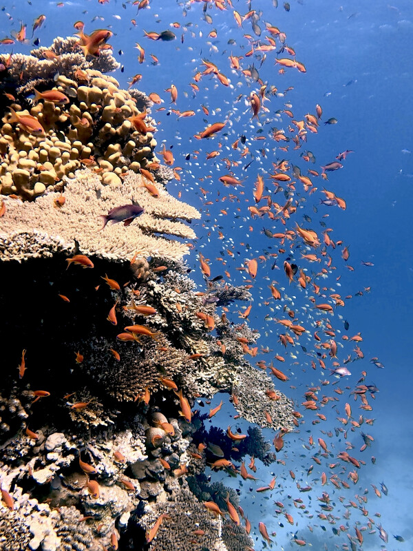 Die ruhige See ausnutzend, fuhren wir in den Norden und besuchten als Erstes Shaab Iris. Wir teilten uns in mehreren Gruppen auf, betrachteten einen Erg nach dem anderen und jeder Einzelne war von Fahnen- und Riffbarschen umhüllt. Insbesondere die unzähligen Sergeants waren die reinste Show. Straßenkehrer standen gechillt an der Ecke, ein Barrakuda und ein Napoleon schauten ebenso vorbei und Gelbsattel-Meerbarben suchten nach einem Snack.