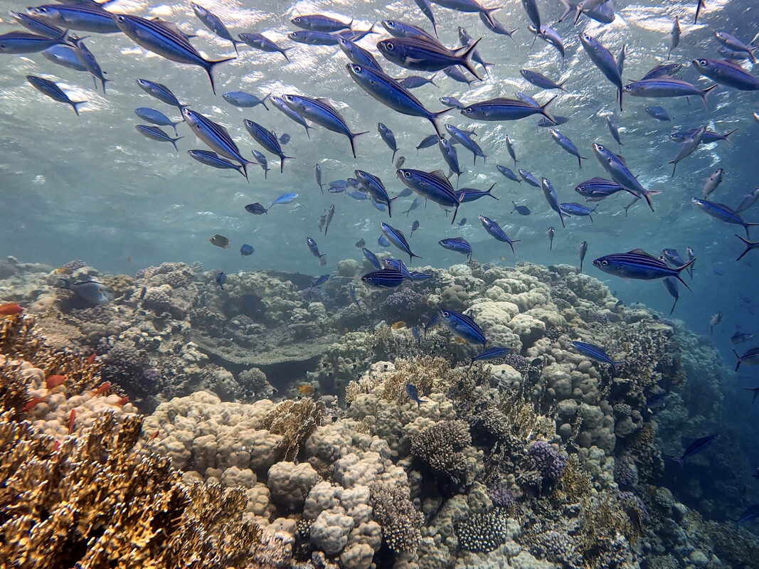 Heute grüßen wir Euch von der Abu Salama. Das Boot ist vollgepackt mit Tauchern, Schnorchlern und einem Rescue-Diver-Kurs. Also, erst mal einen warmen Applaus, denn die Sonne versteckt sich noch etwas. Und schon starteten wir zum ersten Tauchplatz – Giftun Ham Ham. Die Gruppen ließen sich bei perfekten Strömungsbedingungen zum Boot treiben. Durch einen Schwarm himmelblauer Füsiliere ging zu den Gorgonien, wo der Langnasenbüschelbarsch auf uns wartete. Ein freischwimmende Muräne bewegte sich elegant durch die Korallen. Unter dem Boot angekommen gab es noch einen kleinen Napoleon und ein 20-köpfiges Team der Wimpelfische zu sehen. Der Rescue-Diver-Kurs übte verschiedene Szenarien, um in Notfallsituationen korrekt reagieren zu können. Jetzt aber zurück an Bord und über das üppige Mittagsbuffet hermachen, damit anschließend die Pause genossen werden kann.