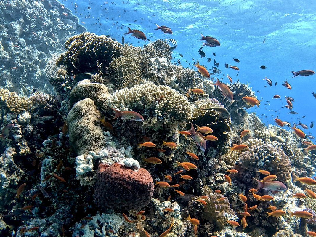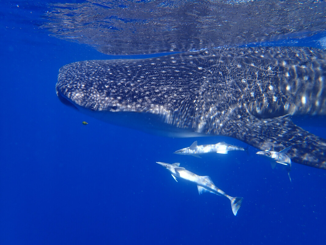 Zurück an Bord stärkten wir uns mit einem leckeren Mittagessen und gönnten uns eine entspannte Pause, bevor es weiter nach Giftun Ham Ham ging. Dort machten wir einen weiteren herrlich entspannten Drift-Tauchgang. Die Liste der Sichtungen war beeindruckend: gleich drei Schildkröten, zwei Adlerrochen, mehrere Barrakudas, flinke Thunfische, ein Steinfisch, dazu jede Menge Gelbflossen-Barben, Füsiliere, Blaupunkt-Stechrochen, Drachenköpfe, Muränen und Blaue Makrelen. Als absolutes Highlight durften wir zum Abschluss sogar noch mit zwei Walhaien schnorcheln. Das war ein unvergesslicher Moment! So ging ein erlebnisreicher und zugleich gemütlicher Tag zu Ende, den wir zurück in unserer Basis bei kühlen Getränken entspannt ausklingen ließen.