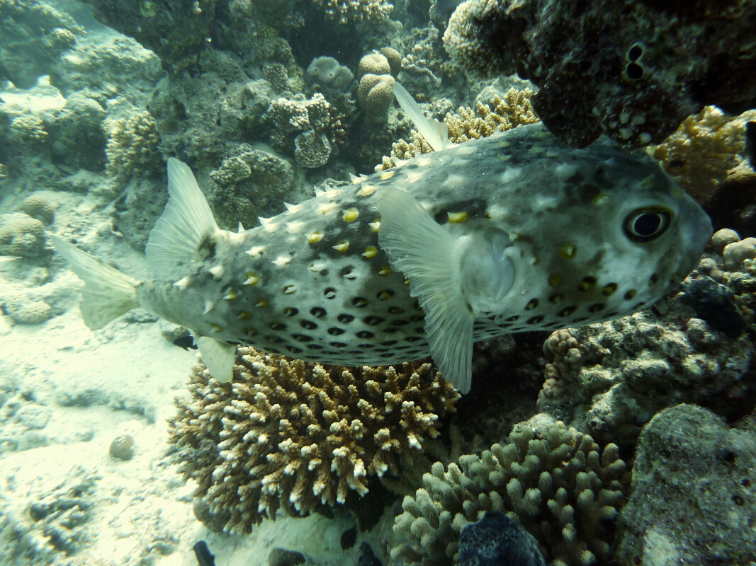 Als Nächstes sprangen wir bei Fanadir Dacht Dacht in die Fluten, einem Platz, der uns in dieser Jahreszeit häufig Sichtungen unterschiedlicher Rochen bietet. Heute waren sie etwas schüchtern und dennoch präsentierte sich ein majestätischer Mangroven-Stechrochen, erneut ein Adlerrochen und zum Ende gleich zwei Grüne Schildkröten mit Schiffshaltern. Hinzu gesellte sich ein niedlicher Pyramiden-Kofferfisch. Nach einem erneut schönen Tag fuhren wir zufrieden zurück in unseren Heimathafen.