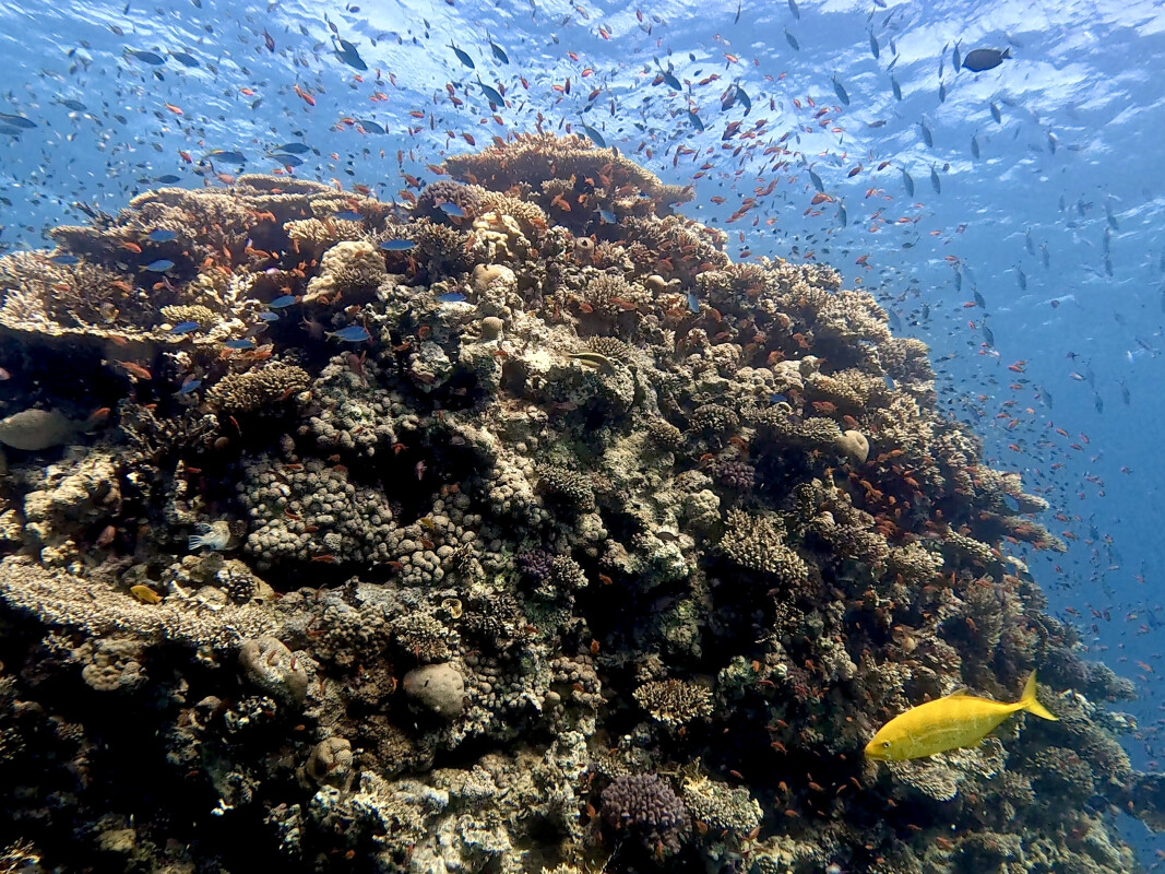 Wir fuhren heute mit dem Tauchclub Murtal sowie weiteren Gästen Richtung Norden und entschieden uns als Erstes für den Tauchplatz Shaab Iris. Wir teilten uns in mehreren Gruppen auf und betrachteten einen Erg nach dem anderen. Allein die Anzahl an Fahnen- und Riffbarschen ist an diesem Platz überwältigend, und auch jagende Makrelen waren immer wieder zu sehen. Des Weiteren erfreuten wir uns an einem Oktopus, Großaugen-Straßenkehrern und einem Adlerrochen.