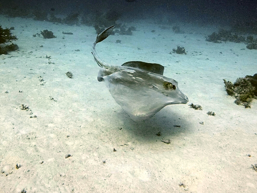 Nach der Begrüßung von Kapitän Adel und der Deckcrew geht die Reise in den Osten nach Shaab Dorfa. Ein Teil von uns geht driften, eine weitere Gruppe taucht stationär. Auf unserer Reise sichten wir zwei Federschwanzstechrochen und einen Oktopus sowie unsere Freunde unter dem Boot, die Fledermausfische. Nach der Stärkung wollen wir uns zum Aufwärmen zurückziehen, doch das unterbinden wir, denn unsere Felukafahrer rufen uns an und berichten von einem Walhai. Also Flossen an und wieder ins Wasser. Der kleine Fisch, ca. drei Meter lang, kreuzt gut fünfzehn Minuten im Kanal und in der Lagune von Shaab Dorfa.