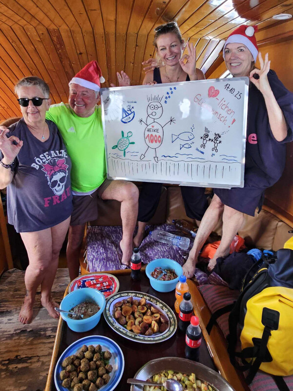 Zurück an Bord gab es nach einer Foto-Session beste arabische Spezialitäten und Limo, bevor wir uns alle langmachten und ein Nickerchen einlegten. Für den zweiten Tauchgang wurde sich Shaab Dorfa gewünscht – und klar – wir erfüllten diesen Wunsch. Beim Abtauchen grüßte uns ein einsamer Barrakuda und am 16er-Block tummelten sich ein paar Fledermausis. In der Lagune tauchten wir aus und schauten einem Tauchkurs bei ein paar Übungen zu. Auf dem Heimweg gibts noch Lecki-Schmecki-Kuchen, um Heike noch einmal zu feiern. Bis morgen, oh du schönes Rotes Meer! Blubb Blubb!