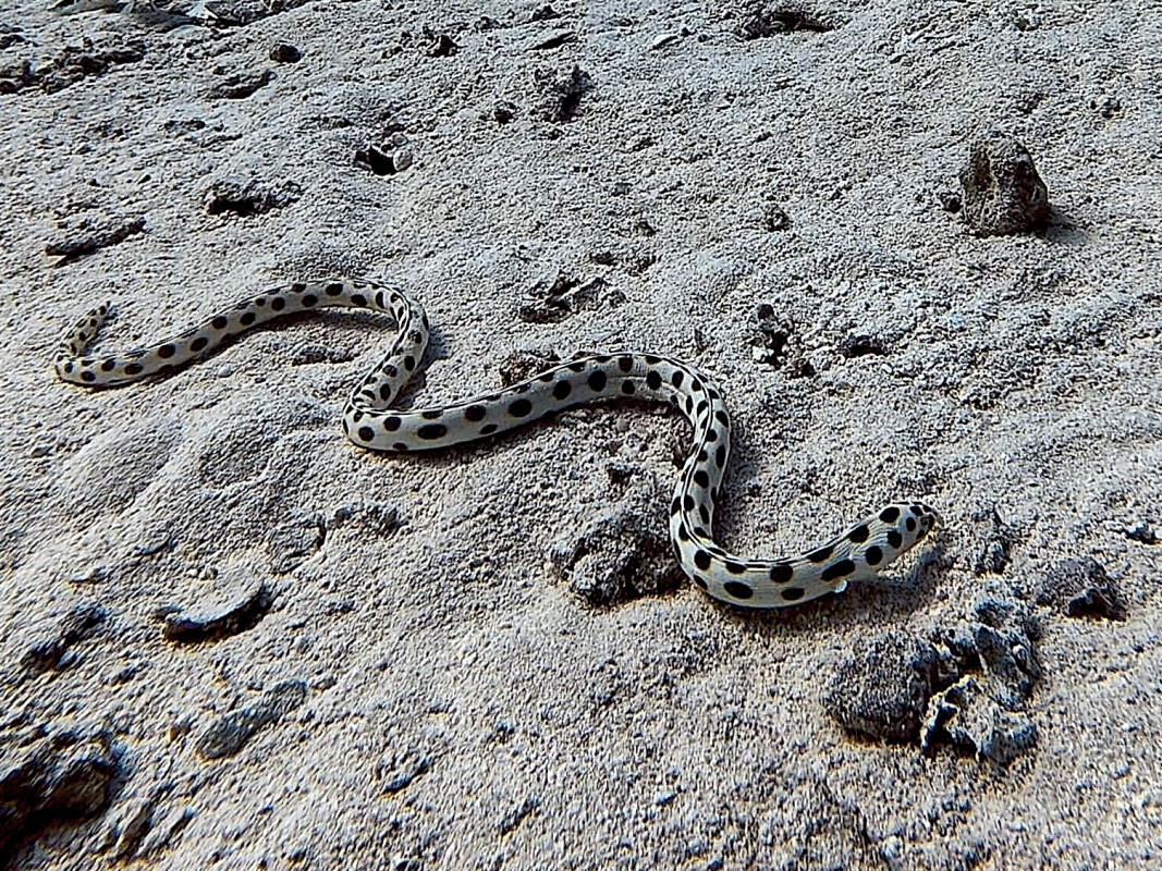 Zurück auf der Musa stärkten wir uns beim Mittagsbuffet. Nach der Pause ging es weiter zum nächsten Tauchplatz: Shaab Tiffany. Nach der Tauchplatz-Info ging es hinein ins kühle Nass. Wir tauchten ab und bekamen sofort einen Gepnkteten Schlangenaal zu sehen. Im gemütlichen Tempo umrundeten wir die Blöcke. Mehrere Seenadeln trafen sich zur Strick-Runde und ein Teppichkrokodilfisch beäugte uns Taucher. Begleitet wurden wir von einem Schwarm Meerbarben und zwei Barrakudas sagten auch noch kurz „Hallo“. Nach einer Stunde ging es dann zurück zum Boot und wir steuerten zufrieden die Shaab Stella Bar an. Bis morgen und Grüße von Simone & Mo Bakr!