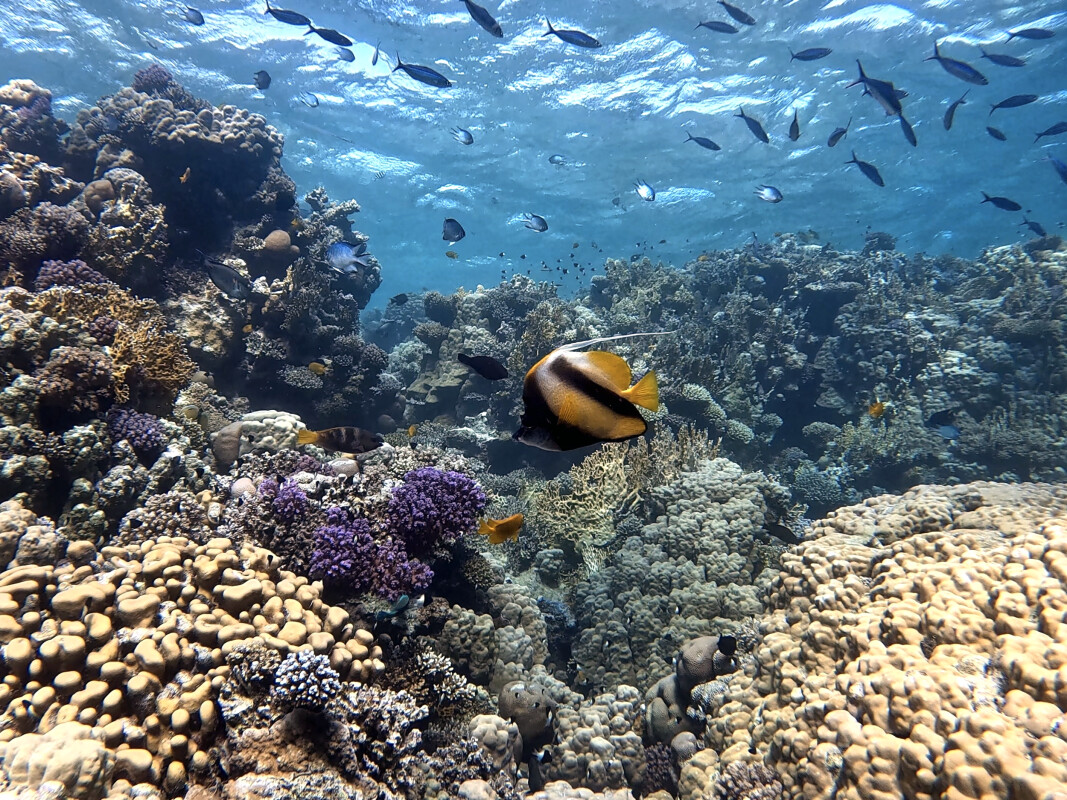 Heute ging es für uns mit gleich zwei Booten raus aufs Rote Meer – die Musa mit unseren Tauchern und die Galambo mit den Schnorchlern. Besonders schön: Die Schnorchler gehören ebenfalls zur Gruppe der Taucher auf der Musa. Es handelt sich um zwei Schulklassen aus Österreich, bei denen nicht alle tauchen, die aber gemeinsam diese besondere Erfahrung auf und im Wasser teilen möchten. Schon beim Rausfahren war die Stimmung top und alle hatten richtig Lust auf einen entspannten ersten Tauchtag. Für den ersten Tauchgang sind wir nach Shaab Dorfa in die Lagune gefahren – ganz bewusst, denn am ersten Tag heißt es: entspannt ankommen, Equipment checken, Bleicheck machen und sich wieder ans Wasser gewöhnen. Also Briefing, anziehen, Buddy-Check und gemütlich rein ins Wasser. Unter Wasser ging es zunächst ruhig los. Jeder sortierte sich, überprüfte seine Ausrüstung und fand seinen Rhythmus. Doch auch hier gab es bereits erste Highlights: Ein Adlerrochen zog elegant durch das Blau und zeigte sich für einen kurzen Moment – immer wieder ein besonderer Anblick. Dazu kamen Muränen und die üblichen Rifffische.