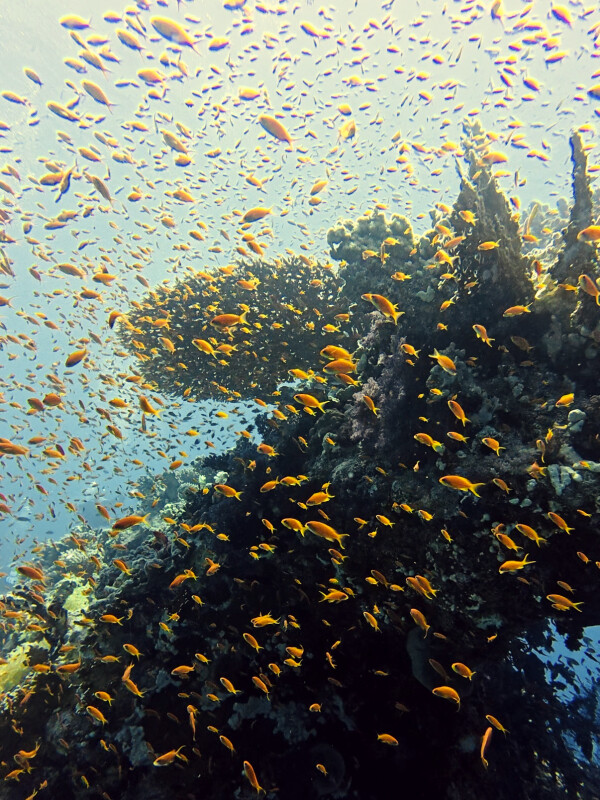 Ein nordisches Moin von der Abu Scharara! Die Sonne scheint, kein Wind in Sicht – perfekte Bedingungen für einen Ausflug in den Norden. Die Gäste applaudieren, Adel startet die Motoren und schon geht es los: „Shaab Rur - Umm Gamar“ ist unser erstes Ziel. Heute wurde das Riff von beiden Seiten betaucht – eine Gruppe an der Ostseite, die andere an der Westseite. Die Kameras liefen heiß: Riesige Schwärme von Füsilieren und Schnappern sorgten für beeindruckende Bilder. An der Riffkante posierten Wimpelfische, während eine kleine Gruppe Sandaale neugierig aus dem Sand herausschaute. Eine große Muräne schlängelte sich entlang der Riffkante bis zur Oberfläche, und die leuchtend orangefarbenen Fahnenbarsche glänzten im Sonnenlicht – ein gelungener Start in den Tag. Zurück an Bord der Scharara stärkten wir uns bei einem leckeren Mittagessen und genossen eine entspannte Pause.