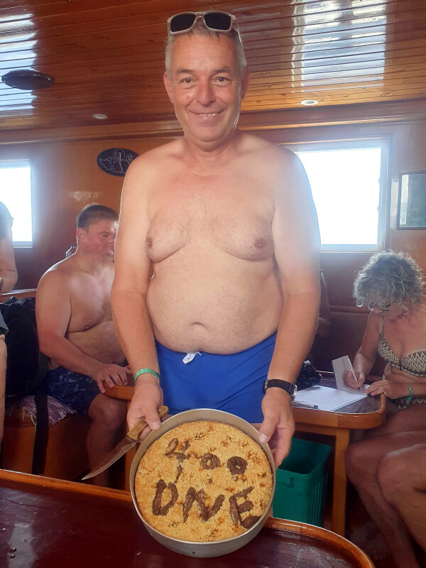 Nach unserem sehr leckeren Mittagessen tauchten wir am Shaab Pinky  und diesmal hatten wir noch mehr Glück! Gleich beim Abtauchen begegnete uns erneut ein Napoleon, außerdem eine Schildkröte, ein Adlerrochen, ein unbekannter Rochen und als absolutes Highlight ein rund vier Meter langer Walhai! Zurück auf dem Boot gab es noch eine besondere Überraschung: einen köstlichen Kuchen zu Ehren von Helmuts 400. Tauchgang. Es war ein wunderschöner Tag am Roten Meer, und wir freuen uns schon auf weitere Unterwasser-Abenteuer morgen! Liebe Grüße von Thorsten, Elodie und der gesamten Musa-Crew!
