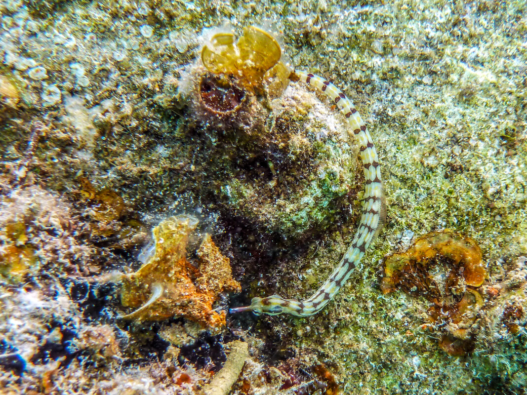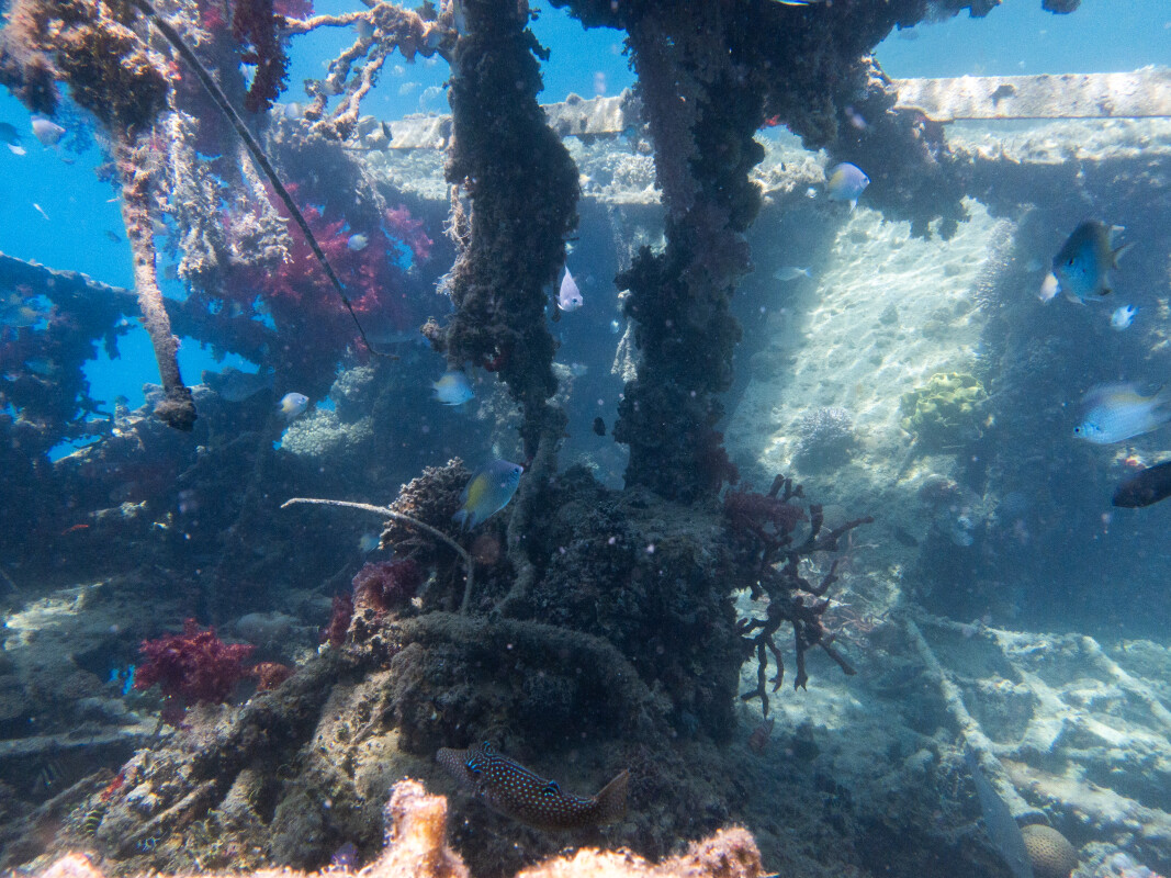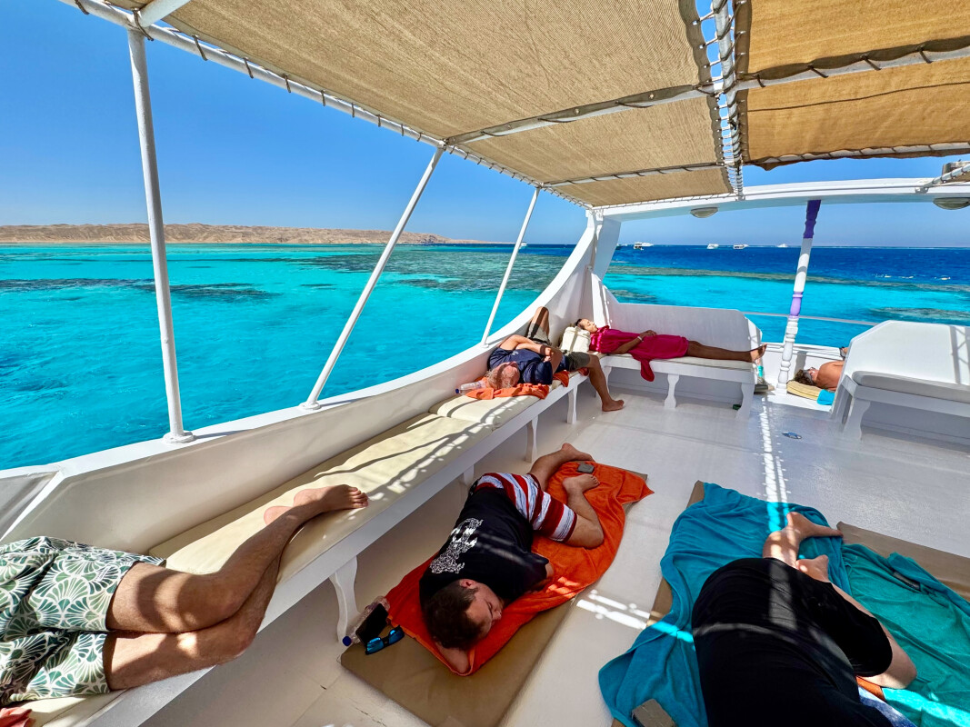 Nach einer verdienten Pause ging es weiter nach Fanadir Foc, wo wir einen Drift zur Leine machten. Die Sicht war zwar eher mittelmäßig, doch zu entdecken gab es trotzdem einiges: einen Schlangenaal, drei Oktopoden und sogar eine kleine weiße Muräne. Nur der Schwarzspitzenhai, der sich zuvor noch in der Lagune blicken ließ, blieb diesmal leider aus. Auf dem Rückweg nahmen wir schließlich noch die Lulu ins Schlepptau – und beendeten so einen weiteren spannenden Tag auf dem Roten Meer.
