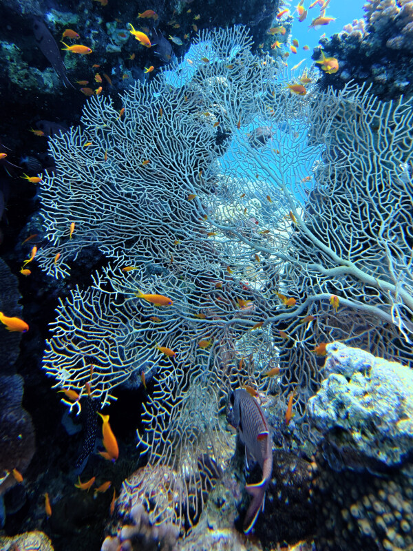 Der zweite Spot lag direkt daneben: Shaab Dorfa. Somit war die Fahrt recht kurz. Auch dort wurde ein Drift gemacht, und aus einem Drift zur Leine wurde ein Drift Pick Up. Entlang des Riffs begleiteten uns erneut zahlreiche bunte Rifffische, darunter Papageienfische, Doktorfische und ein paar flinke Flötenfische. Mit etwas Glück erspähten wir außerdem einen Barrakuda in der Ferne sowie einen kleinen Schwarm Glasfische, der im Licht funkelte. Zufrieden nach einem tollen Tauchtag begaben wir uns auf den Rückweg und ließen den Abend im Shaab Stella ausklingen.
