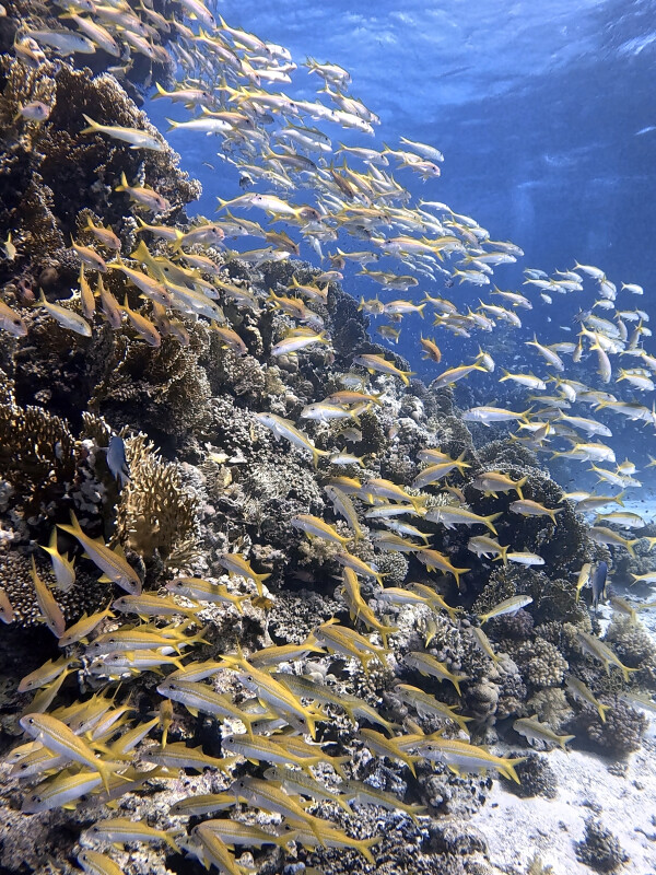 Wir konnten die Verfolgungsjagd nicht weiter beobachten, denn wir wurden von einem großen Barrakuda abgelenkt, der wie ein anmutiger Jäger in der Strömung stand. Als wir seinen glitzernden Anblick bewundert hatten, genossen wir die Aussicht auf die Meerbarbenschwärme, die vor den Hirnkorallen standen. Hier im Aquarium ging es heute Schlag auf Schlag – man könnte sagen, Flossenschlag auf Flossenschlag. Wir konnten zwei große Napoleons entdecken, die in einiger Entfernung in aller Ruhe am Hauptriff vorbeischwammen. Auf dem letzten Stück zum Boot entschieden wir uns, durch die Gebirge aus Hirnkorallen zu tauchen – ein tolles Gefühl mit atemberaubendem Anblick auf das wunderschöne Riff. Im Anschluss begegneten uns erneut zwei kleine Barrakudas, die sich jedoch schnell im Blau versteckten, als wir näher kamen. An unserem Boot angekommen, genossen wir ein leckeres Mittagessen, entspannten in der Sonne und philosophierten über vergangene Taucherfahrungen und unsere schönsten Begegnungen unter Wasser.