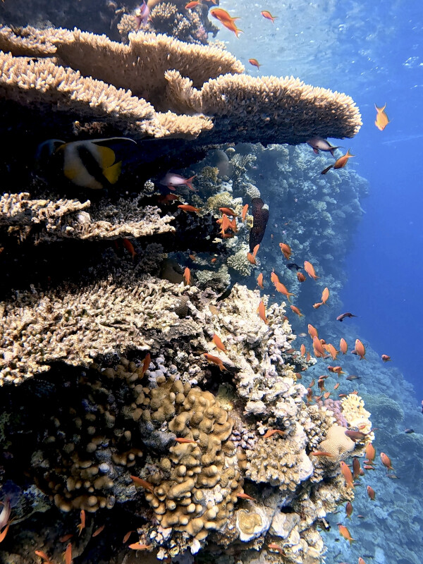 Schnell hatten wir uns entschieden, heute als erstes mit einem Tauchgang an der Südostseite von Umm Gamar zu beginnen. Wir tauchten entspannt von der Leine und machten uns auf den Weg zu den markanten Blöcken an der Steilwand. Auch besuchten wir die Höhle, was wiederum zur lustigen Luftblasenbildung auf dem Rückweg führte, bevor wir ausführlich das Plateau inspizierten. Wir sahen zwei Napoleon-Lippfische, einen Teppich-Krokodilfisch, einen Schrift-Feilenfisch, Doppelfleck-Schnapper, Masken-Falterfische sowie einen Fransen-Drachenkopf.