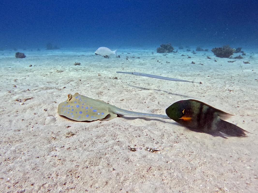 Mit der Lulu und unserer Einsteigertour ging es heute nach Shaab Eshta. Gleich zu Beginn begegnete uns ein neugieriger Blaupunktrochen, der uns fast den gesamten Tauchgang über begleitete. Wenn wir die Richtung wechselten, tat er es uns gleich – offenbar wollte er kein bisschen von uns ablassen. Neben ihm sahen wir auch einen Drachenkopf und einige Feuerfische, die zwischen den Korallen auf Beute lauerten. Zum Abschluss des Tauchgangs entdeckten wir noch einen weiteren Blaupunktrochen – doch diesmal war es nicht derselbe! Dieser hatte einen ganz besonderen Begleiter: einen Flötenfisch, der ihm nicht von der Seite wich. Zusammen sahen sie fast aus wie ein schwimmender Schiffsanker – ein witziges und zugleich herzerwärmendes Duo.