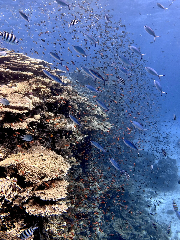 Direkt nach dem Verlassen von James & Mac tauchten vor dem Boot zwei Delfine auf, ein schöner Start in den windfreien Tag. Auf ging es danach nach Shaab Iris. Dort waren wir das einzige Boot, als wir ankamen. Die Strömung kam aus dem Süden; aus diesem Grund tauchten wir direkt in den Fischschwärmen ab zu unserem ersten Tauchgang. Über dem Block, an dem wir festgemacht hatten, ließ sich ein etwa ein Meter langer Barrakuda von Putzerfischen das Maul säubern und ließ sich selbst von unserer Schnorchlerin nicht verjagen. Zum Auftauchen durften wir wieder durch die Tausenden von Fischen.