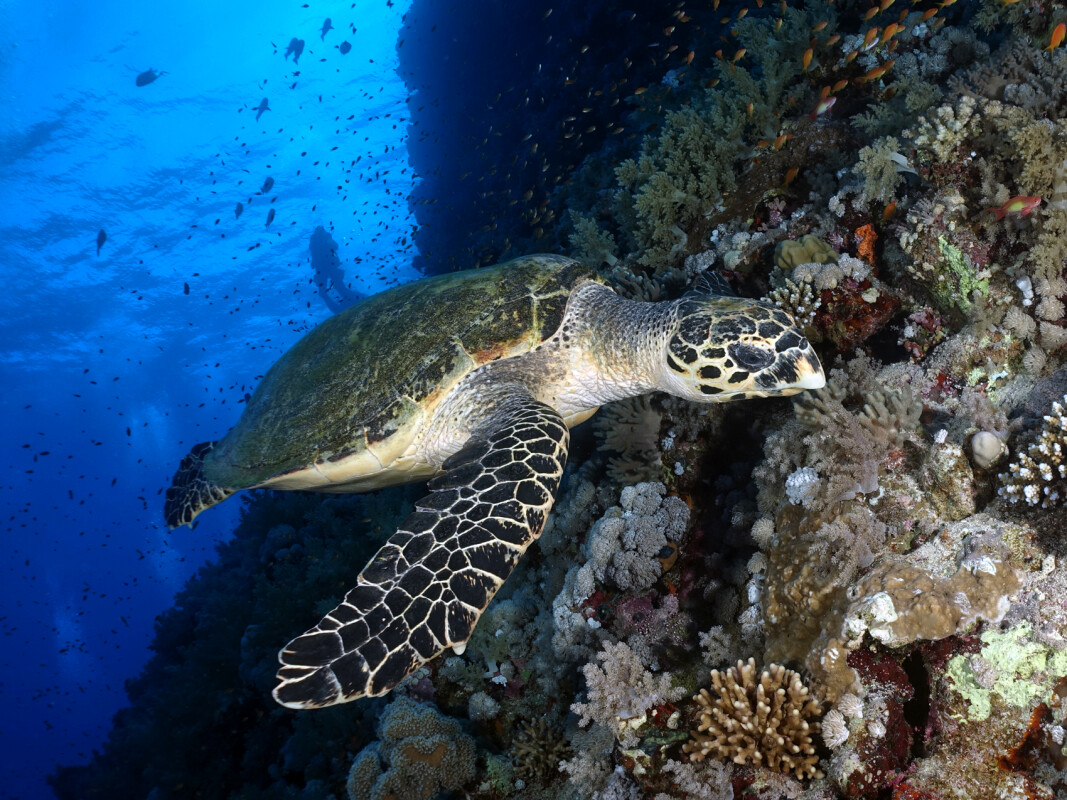Moin von der El Vardus. Nach einem großen Applaus für Kapitän und Crew ging es los bei besten Wetterbedingungen. Kein Wind und die Sonne schien, also freie Auswahl bei der Tauchplatzwahl. Wir entschieden uns gemeinsam für den ersten Tauchgang bei Shaab Timmi Dacht. Unser heutiges Motto: „Come on Baby, let’s do the Drift“ – also Übersicht über den Tauchplatz in Form einer bunten Illustration und alle Informationen beim Briefing. Danach Neopren, Plattform stehen, Fische sehen. Mit leichter Strömung im Rücken ging es entlang der Riffkante Richtung Süden. Neben Schwärmen von Fahnenbarschen, die sich an den Korallenblöcken im Takt der Wasserbewegungen tanzten, glitt ein Adlerrochen anmutig an uns vorbei, zwei Schildkröten genossen ihr Frühstück am Korallenbuffet und im Blau war ein Schwarm Milchfische zu sehen. Jetzt aber Boje setzen und auf das Vardus-Taxi warten, damit wir zum Mittagessen eingesammelt werden.