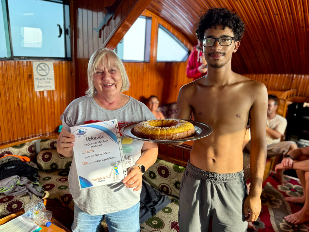 Danach ruhten wir uns während der Mittagspause ordentlich aus, nachdem wir gut gegessen hatten. Den zweiten Tauchgang machten wir in Sachua Abu Galawa. Begrüßt wurden wir hier kurz vor dem Festmachen wiederum von Delfinen – diesmal waren es vier. Während des Tauchgangs, der für eine unserer Taucherinnen der 800. war, bestaunten wir unter anderem eine Schildkröte, einen Oktopus, 13 Kalmare, einen Buckeldrachenkopf, einen Marmoraal, einen Steinfisch und eine Schnecke. Wie gesagt: unter anderem … Sehr zufrieden feierten wir den 800. Tauchgang von Christa auf der Rückfahrt mit leckerem Kuchen.