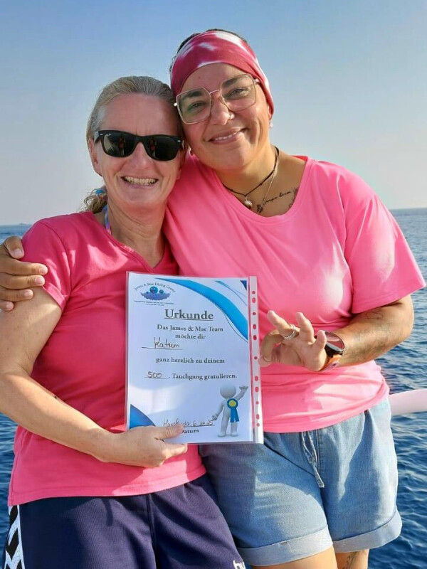 Der zweite Akt dieses ozeanischen Balletts führte uns von Shaab Alex nach Shaab Khalifa – ein Drift Pick Up, der sanft anmutete wie ein Sommerreigen. Zwar blieben Schildkröten und Adlerrochen heute der Gesellschaft fern, doch ein Blaupunktrochen beim Festmahl und eine stolze Schar Nasendoktorfische übernahmen die Hauptrollen – ein würdiger Ersatz, der das Herz dennoch höherschlagen ließ. Und dann – welch Triumph! – Katrin feierte ihren 500. Tauchgang. Ein halbes Tausend Tauchgänge, ungezählte Geschichten, und jedes Bläschen eine Erinnerung. Lady Whistlejay zieht ihren Hut (oder sollte man sagen: ihre Maske?) und verneigt sich vor dieser tapferen Dame der Tiefe. Zum Ausklang des Tages ruft die Shaab Stella Bar mit Bier, Käse, Salami und Brot. Eine Brotzeit, die selbst Poseidon nicht verschmähen würde.