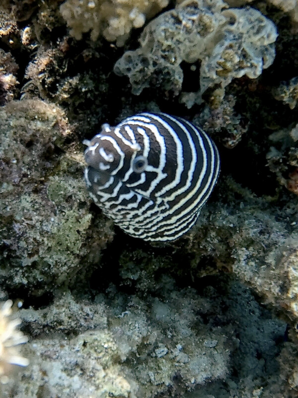 Alle Taucher gönnten sich nach diesem Hammer Erlebnis am Riff eine leckere Stärkung an Board, um gekräftigt und ausgeruht etwas später bei Shaab Estha ein erneutes Abenteuer zu wagen. Während einige ihre Unterwasserfertigkeiten trainierten, dabei von Blaupunktrochen mit perfekten Unterwasserfertigkeiten beobachtet wurden, erkundeten andere Taucher die Umgebung. Dabei kreuzten ganze 5 Skorpionfische ihren Weg. Etwas später kam ein mittlerer Barakkuda dazu und einige Feuerfische. Auch ein kleiner gepunkteter Schlangenaal schlängelte sich am Grund über den Sand. Doch etwas verfolgte die Taucher wohl, den auch hier fand sich plötzlich eine seltene Zebramuräne! Zufrieden und mit neuen Eindrücken eines Abenteuers geladen erreichten die Gruppe an Tauchern etwas später mit der Salama den Hafen. Zum Ausklingen und etwas Trinken ging es schliesslich gemeinsam zur Shaab Stella.