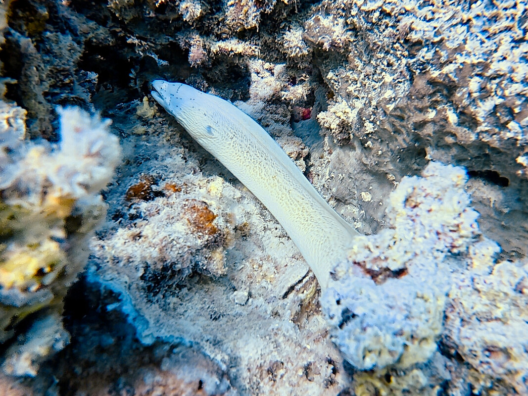 Anschließend machten wir uns nach einem farbenfrohen Tauchgang wieder auf den Weg zur Musa. Auch der Rescue-Kurs war heute wieder fleißig, denn wir trafen die drei bei ihren Übungen an der Oberfläche an. Anschließend wurden wir auf der Musa mit Suppe und Essen versorgt und genossen eine Mittagspause. Doch die Ruhe blieb nicht lange bestehen, denn bald klingelte die Glocke erneut – wir waren bereits an unserem nächsten Tauchplatz angekommen. Marsa Abu Galawa wartete auf uns. Kaum gesprungen, entdeckten unsere Adleraugen etwas Weißes an einem Block. Wer tummelt sich denn da? Es war eine Graue Muräne, die im Riff ihr Zuhause gefunden hatte. Wir bewunderten sie, wollten sie aber nicht weiter stören. Anschließend machten wir uns über den bunten Korallengarten hinweg auf den Weg zur Drop Off Kante. Dort wurden wir von einem Steinkorallengarten empfangen. Wir spürten außerdem einen deutlichen Temperatursprung nach unten. Wir bewunderten die großen Blöcke und tauchten im Zickzack umher, um alles zu bestaunen. Es fühlte sich fast so an, als würden wir durch ein Gebirge schwimmen.