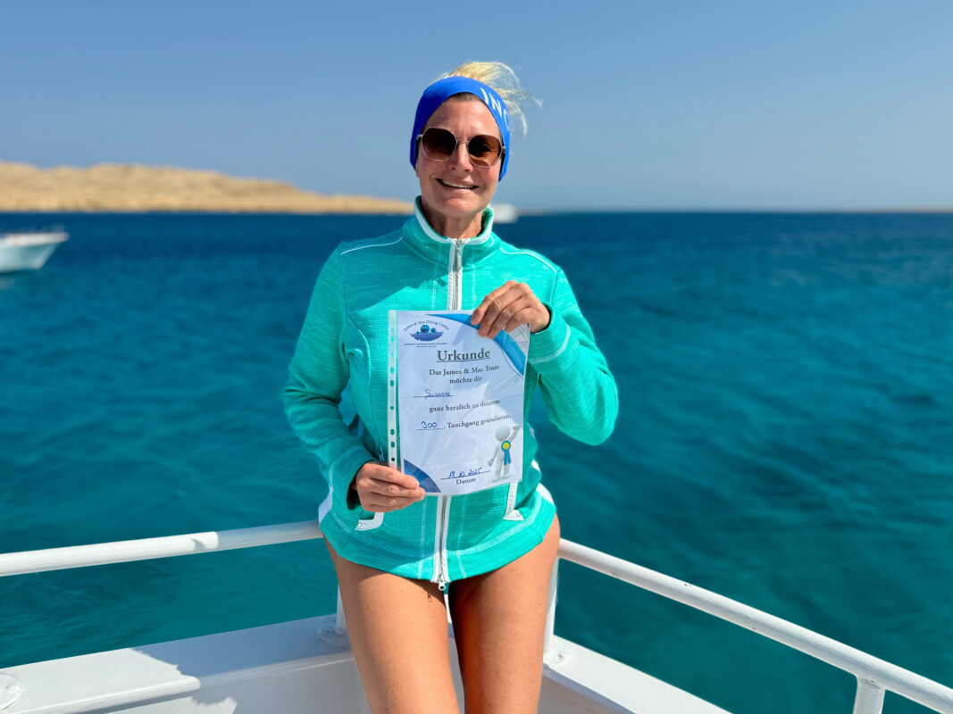 Nach einem sehr leckeren Mittagessen ging es noch einmal ins Wasser. Dieses Mal trafen wir eine riesige Muräne und einen Barrakuda. Michel, Jannes, Greta und Johannes haben ihre Kurse erfolgreich abgeschlossen! Herzlichen Glückwunsch an euch vier! Es war wieder ein wunderschöner Tag am Roten Meer und wir freuen uns schon auf morgen – für noch mehr Unterwasser-Abenteuer! Liebe Grüße von Elodie und der Lulu-Crew!
