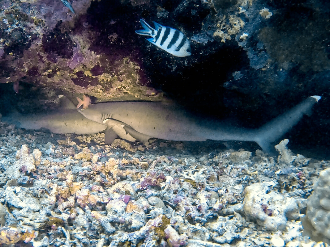 Als Erstes wollten wir heute nachschauen, ob die Weißspitzen-Haie ihr winterliches Domizil in den Höhlen bei Fandira aufgesucht haben. So inspizierten wir die drei typischen Behausungen in den unterschiedlichen Tiefen und tatsächlich hatten wir Glück bei der 12er-Höhle, in der vier Exemplare zu entdecken waren. Weiterhin hatten wir eine riesige Grüne Schildkröte, eine Spanische Makrele, einen Milchfisch sowie tolle Schwärme von Füsilieren und Rotzahndrückern.