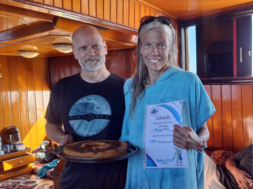 Heute beginnen wir den Tag auf der Scharara mit einem kräftigen Applaus für die Crew – und natürlich einem Geburtstagsständchen für Captain Adel! Herzlichen Glückwunsch und alles Gute! Dann heißt es: Leinen los! Bunt und tief soll es heute werden, also wählen wir Stone Beach für unseren ersten Tauchgang. Loris präsentiert seiner Deep Dive Schülerin ein aufgeschlagenes Ei unter Wasser – ein echter Klassiker! – während alle anderen auf verschiedenen Tiefenleveln auf Entdeckungstour gehen. Gesichtet werden Blaupunktrochen, Muränen, die größte Salatkoralle Hurghadas und gleich zwei Schwärme „Abu Scharara“ (Großaugenbarsche). Nach einem gut gefüllten Teller vom tollen Buffet fallen dem einen oder anderen bald die Augen zu. Währenddessen schunkelt uns Captain Adel schon gemütlich hinüber zur Insel Abu Ramada. Wer 1.000 Tauchgänge voll hat, darf sich natürlich einen Tauchplatz wünschen – und Anja wählt das legendäre Plateau!