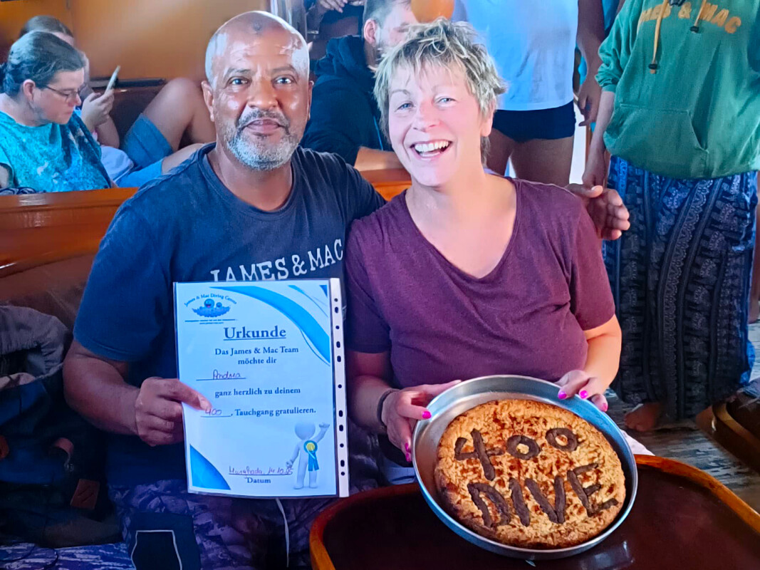 Den zweiten machten wir, ebenfalls als fröhlichen Drift, von Erg Camel zum Pizzaofen. Alle Höcker wurden inspiziert, wir machten einen Ausflug zum Drop Off, bevor wir über die Sandaale zum Hauptriff navigierten. Den Pizzaofen umkreisten wir und tauchten unter dem Boot aus. Uns wehte der Duft von frischem Rührkuchen aus der Kombüse entgegen und damit feierten wir Andrea's 400. Tauchgang. Herzlichen Glückwunsch und weiterhin viel Blubb Blubb! Schön war der Tag, Bis morgen, geliebtes Rotes Meer!