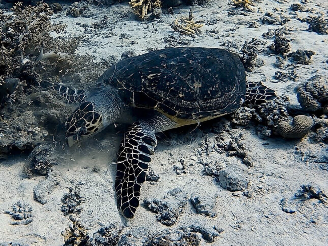 Wir machten uns nach einem tosenden Applaus für Kapitän und Crew auf den Weg hinaus aus dem Roten Meer. Das Meer sah heute besonders schön aus, denn es war so unglaublich ruhig und windstill, dass wir dies ausnutzen mussten und den direkten Weg in Richtung Norden einschlugen. Wir bauten mit viel Vorfreude unser Equipment auf, bis wir an unserem geliebten Carless Reef ankamen, ein Tauchplatz, der definitiv zu den Favoriten gehört, denn er ist einfach unglaublich schön. Kaum gesprungen, wurden wir von einem kunterbunten Korallengarten empfangen, der uns in all seiner Pracht entgegenstrahlte und zu sich rief. Wir folgten seinem Ruf und ließen uns gemächlich durch den Korallengarten treiben, entlang der beiden großen Blöcke. Viele kleine, bunt bewachsene Blöcke wurden von unseren Fotografen abgelichtet, denn die Tausenden von Fahnenbarschen, von denen sie umhüllt wurden, machten das Fotomotiv perfekt. Zwischen kleineren Blöcken in diversen Formen entdeckten wir eine weiße Schleimwolke über dem Boden. Was ist denn da los? Wir näherten uns neugierig und entdeckten eine Schildkröte, die ihr Frühstücksbuffet im Weichkorallengarten gefunden hatte. Der Anblick war einfach zum Dahinschmelzen süß. Nachdem wir sie eine Weile bei ihrem Frühstück beobachtet hatten, setzten wir unseren Tauchgang fort – denn wer wird schon gern beim Essen beobachtet?