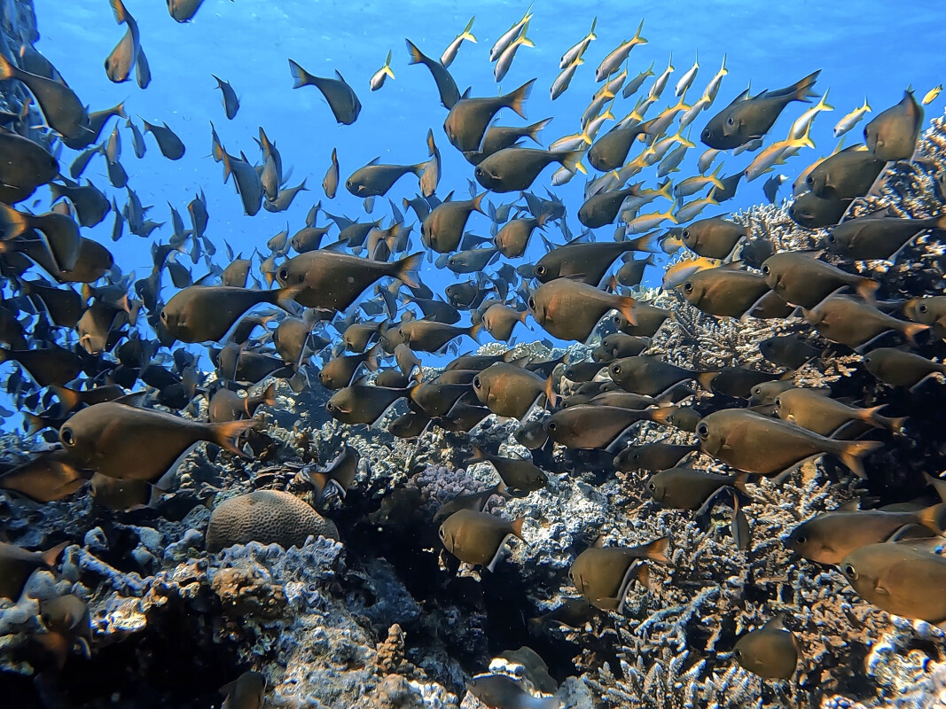 Abgesehen von der Fracht der SS Thistlegorm gibt es auch viel Meeresleben zu bestaunen. Ganze Schwärme von Soldaten- und Beilbauchfischen sowie viele Nacktschnecken, Skorpionfische und Gelbmaulmuränen haben das Wrack zu ihrem Zuhause gemacht. Rund um die Thistlegorm wurde man von zahlreichen Fledermausfischen begleitet, und sogar ein großer Napoleonfisch war zu Besuch. Zum Schluss, bei unserem Safety-Stop, durften wir noch das Jagen und Treiben der Stachelmakrelen beobachten. Während unserer Oberflächenpause wurde uns zudem eine leckere Suppe serviert. Nach den beiden eindrücklichen Tauchgängen gab’s dann erst einmal ein ausgiebiges Mittagessen – und zum Dessert noch ein Eis dazu. Auf der Rückfahrt hieß es nun: entspannen und die Aussicht genießen.