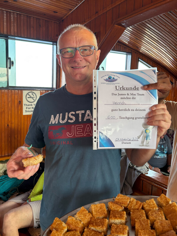 Dort hieß es „Triple B“ für Boje, Blei und Buddy – und los ging der Drift Pick Up. Im Blauwasser genossen wir den Anblick auf himmelblaue Füsiliere, Rotzahndrücker sowie Streifenfüsiliere. Wir warteten hoffnungsvoll darauf, dass größere Wanderer unseren Weg kreuzen würden, doch leider hatten wir heute kein Glück. Trotzdem genossen wir die Ruhe im Blauwasser in vollen Zügen. Am Grund konnten wir einen Torpedorochen entdecken, und am Hauptriff begegneten wir unseren üblichen Freunden des Roten Meeres. Wir erfreuten uns an Muränen, Blaupunktrochen und Kugelfischen. Als wir die Boje geschossen hatten, kreuzte noch ein riesiger Schiffshalter unseren Weg – wohin er wohl gehörte? Das Galambo-Taxi sammelte uns ein, und an Bord hatten wir noch richtig was zu feiern: Heinrich hat heute seinen 600. Tauchgang gemacht! Darauf ließen wir uns ein Stück Kuchen schmecken und wünschen ihm viele tolle Unterwasserbegegnungen für die Zukunft. Somit machten wir uns nach diesem gelungenen Tag auf den Heimweg, denn die Shaab-Stella-Bar wartet schon auf uns. Bis zum nächsten Mal – sonnige Grüße von der Galambo wünschen Janina & Simone!