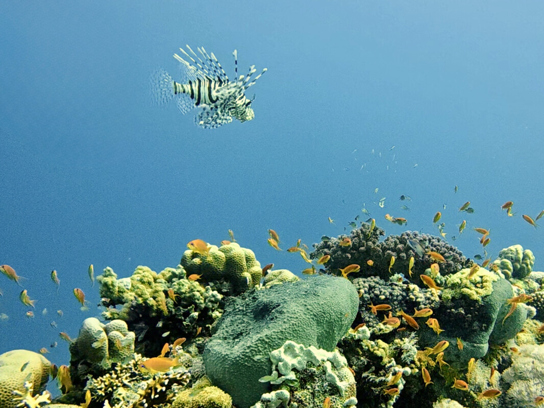 Nach dem Auftauchen legten wir die Ausrüstung ab und genossen anschließend ein sehr leckeres Mittagessen. Danach hatten wir etwa eine Stunde Pause. Für den zweiten Tauchgang entschieden wir uns für Shaab Samir. Das Briefing machten wir während der Fahrt dorthin. Unter Wasser erwarteten uns wieder tolle Sichtungen: eine freischwimmende Muräne, Skorpionfische, vier Delfine, ein Adlerrochen, eine Schildkröte, ein Oktopus, ein Krokodilfisch und weitere Rotfeuerfische. Nach dem Tauchgang zogen wir uns um und fuhren zurück. Die Gäste waren heute sehr glücklich – es war wirklich ein wundervoller Tag.