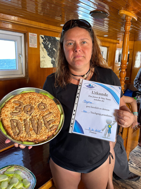Auch für den zweiten Tauchgang teilten wir uns in zwei Gruppen. Die eine Gruppe machte Shaab Quais Panzer und die andere Maksur. Hier konnten wir Krokodilfische, Drachenköpfe und eine leuchtend rote Anemone sehen. Herzlichen Glückwunsch an Dagmar zum 300. Tauchgang!