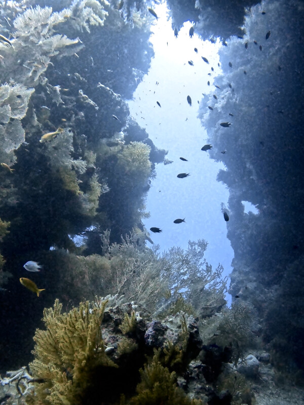 Nach einer ausgedehnten Pause entschieden wir uns für einen Drift bei Ham Ham in Verbindung mit Pick Up. So hatten wir Gelegenheit, uns ausgiebig mit dem fantastischen Gorgonienwald und der Steilwand zu beschäftigen und im flacheren Bereich eine andere Richtung einzuschlagen. Dabei erfreuten wir uns an zwei Lanabübas, einem Großen Thunfisch, einer Dickkopf-Makrele, einem Adlerrochen sowie einem Schwarm mit über hundert Segelflossern. Zufrieden ging es zurück in unseren Heimathafen.