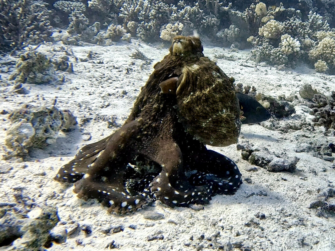 Unter lautem Applaus für Kapitän Hamada und seine Crew machten wir uns heute auf den Weg Richtung Norden, genauer gesagt nach Shaab Iris. Und dieser Platz zeigte sich heute von seiner absolut besten Seite: keine Strömung, fantastische Sicht und Fische ohne Ende! Eine riesige Gruppe kleiner Makrelen schwamm auf uns zu, Füsiliere und Zebrafische zogen auf dem Plateau zwischen den kleinen Korallenblöcken umher und im Blau standen Großaugen-Straßenkehrer und beobachteten das Schauspiel. Wir hatten auch das Glück, einen Oktopus zu treffen, der völlig frei dasaß und sich mit seinem Farb- und Strukturwechsel bemerkbar machte. Und eine Gruppe sah sogar einen Adlerrochen! Vollkommen zufrieden kehrten wir zur Musa zurück und dann war es Zeit für ein leckeres Essen. Nach dem Essen kommt natürlich ein kleines Nickerchen – aber nein, nicht heute! Hamada hatte Delfine gesehen, also fuhren wir dorthin und verbrachten unsere Pause vom Boot aus damit, eine große Gruppe schlafender Delfine zu beobachten, die immer wieder an die Oberfläche kamen. Schöner kann ein Tag am Roten Meer kaum sein!