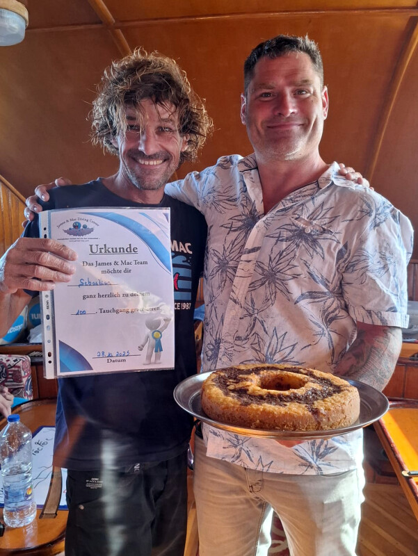 Auch bei unserem Tauchgang in Gotha Iris waren wir sehr erfolgreich. Wir sahen einen Torpedorochen, viele Skorpionfische, eine Schule von Milchfischen, einen Baby-Napoleon und einen Barrakuda. Ein Oktopus hat sich offenbar in Miriam verliebt – er wollte sie glatt mit nach Hause nehmen! Zum Glück wurde sie rechtzeitig von François-Xavier gerettet. 🙂 Während des Schnorchelns wurde außerdem ein Manta gesichtet. Sorry, Delfine, aber das war heute noch ein größeres Highlight! 😉 Besonders schön war der Tag für Chris, der heute seinen 200. Tauchgang feiern konnte. Ein rundum wundervoller Tag am Roten Meer! Wir freuen uns schon auf morgen und auf neue Unterwasserabenteuer! Liebe Grüße von JJ, Momo, Florian, Elodie und der gesamten Bahlul-Crew!