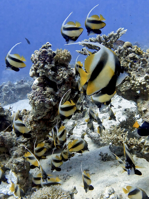 Die Dreisten Drei begrüßten die heutige Ganztagesfahrt von der Abu Galambo. Da der Wind erst gegen Mittag etwas auffrischen sollte, beschlossen wir, den ersten Tauchgang bei Giftun Soraya Ham Ham zu machen. Genügend Guides an Bord ermöglichten den Gästen, diesen Tauchplatz in zwei Varianten zu betauchen. Eine Gruppe nahm die Einbahnstraße – Drift zur Leine –, die andere Gruppe genoss die entspannte Version als stationären Tauchgang. Unter dem Boot verteilten sich ca 50 Wimpelfische auf dem Plateau und Muränen schlängelten sich von Block zu Block. Die One-Way-Gruppe entdeckte in den Gorgonien unseren Freund, den LaNaBüBa und zwei sich liebende Titan-Drückerfische begleiteten uns fast bis zum Boot. Im Sicherheitsstopp waren wir umringt von Füsilieren, was für ein schöner Anblick! Jetzt aber hoch, denn aus der Kombüse stieg uns ein sehr schmackhafter Duft in die Nase. Also Essen fassen und Pause machen, bevor wir uns wieder hübsch für Neptuns Reich machten.
